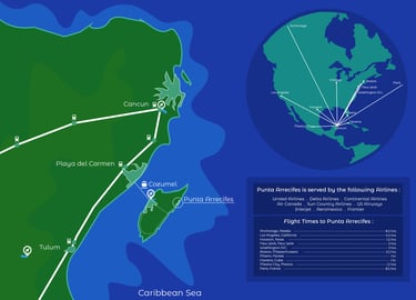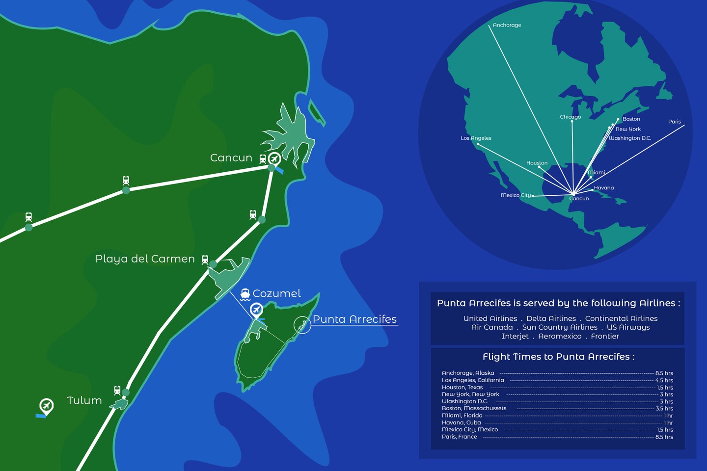 Punta Arrecifes, the jewel of Cozumel Island, is located in one of the most secure and secluded vacation destinations in the world. The Island possesses its own International Airport which provides direct access to major US, Mexican, and Caribbean cities.