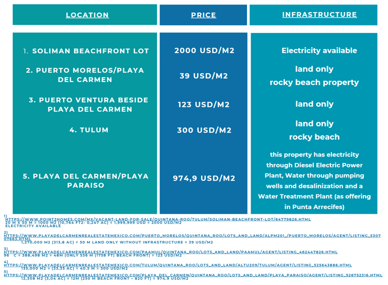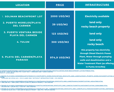 Price comparison on the island of Cozumel and other places in Quintana Roo in 2023 with and without infrastructure access (most without density authorization)